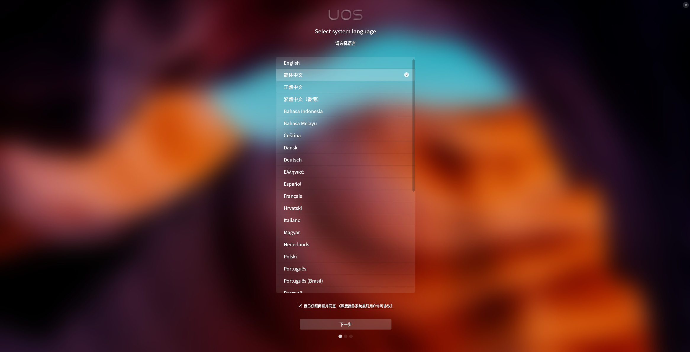 语言选择界面,可以看到下面同意的是深度的用户许可协议