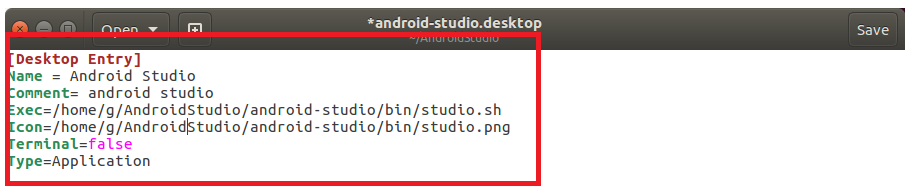 1. 在终端执行命令 sudo gedit /home/g/AndroidStudio/android-studio.desktop