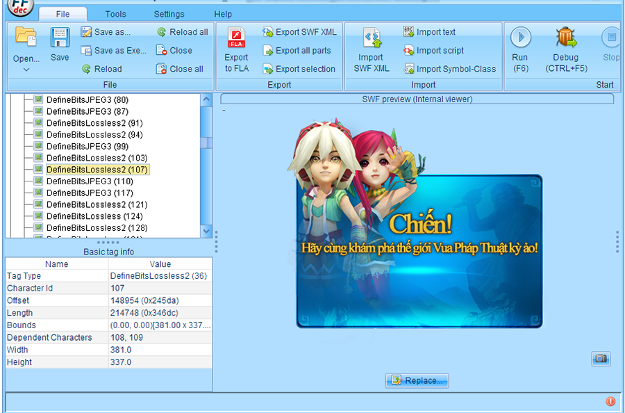 Now the output file 00000000.cws can be opened in JPEXS. You can rename this to 00000000.swf.