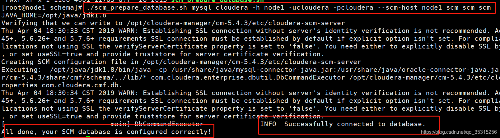 ./scm_prepare_database.sh mysql cloudera -h node1 -ucloudera -pcloudera --scm-host node1 scm scm scm
