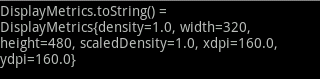 通过 DisplayMetrics的 toString()方法可以获取到 DisplayMetrics的大部分 fields信息,如下是在分辨率为 480x320情况下的一些输出信息: