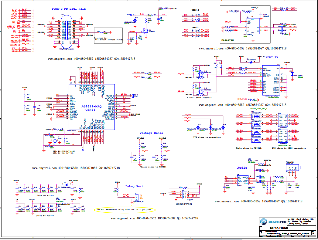 以上就是AG9311带PD3.0的USB TYPE-C转HDMI数据转换电路设计的整体原理图,另外还可以提供AG9311的DEMO板方便大家进行各种功能的测试和验证。