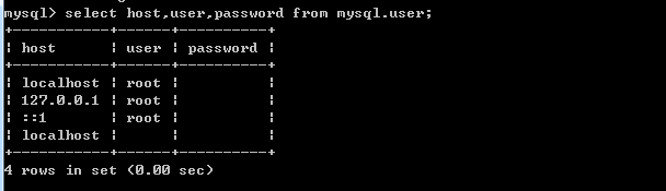 当用户密码为空(’’不是null)的时候可以直接连接数据库服务,如上图host列表示可以连接的主机ip,localhost,127.0.0.1,::1都是表示本机,::1是IPV6的表示方法。就是说只允许主机没有密码连接,还有一个通配符%表示任意,例如,最常见的表示就是host设置为192.168.%.%用来限制只有指定的网段能够通过这个用户这个密码连接MySQL服务。