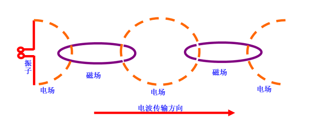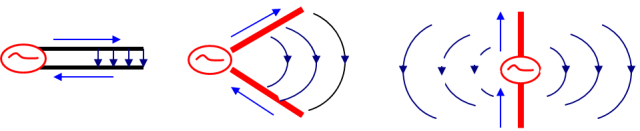 如果导线位置如由于两导线的距离很近,且两导线所产生的感应电动势几乎可以抵消,因而辐射很微弱。如果将两导线张开,这时由于两导线的电流方向相同,由两导线所产生的感应电动势方向相同,因而辐射较强。当导线的长度远小于波长时,导线的电流很小,辐射很微弱。
