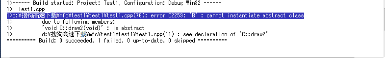 在上述的代码中我们新加入了一个类C,它里面包含了一个虚函数draw1,以及一个纯虚函数draw2;然后我们让B继承这个类,并且在B类中我们重写了draw2函数,如果不重写那么会出现以下错误: