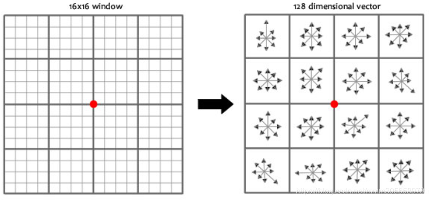 6.1 关键点可能不位于像素内,此时需要插值,周围16*16像素构成窗口计算特征向量; 每个4*4窗口像素根据梯度值和方向分为8个bins方向的直方图;最后以关键点为中心通过高斯核平滑每个窗口值,并生成8*16=128维特征向量;最终标准化除以平方和的根。为了达到旋转不变性,4*4 和 16*16窗口每个方向减去关键点的旋转使得以关键点为主方向。为了减少光照依赖性,任何大于0.2的数都设置为0.2。