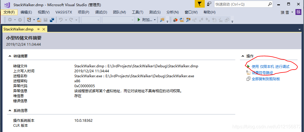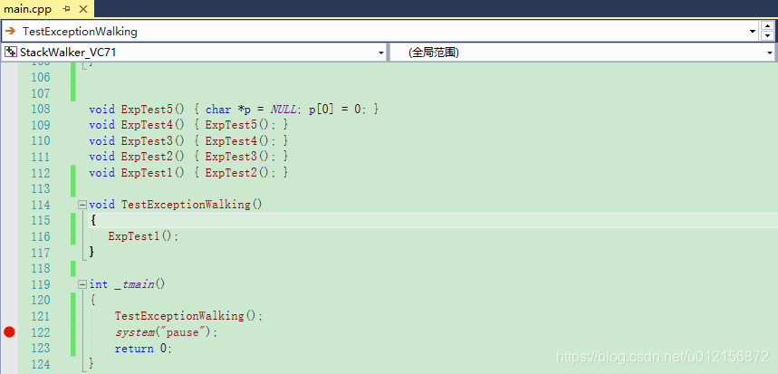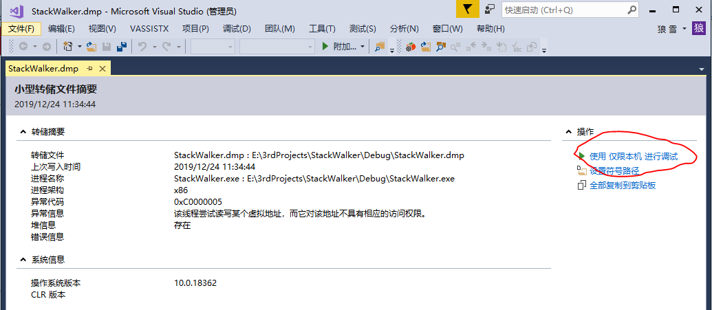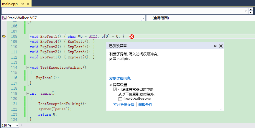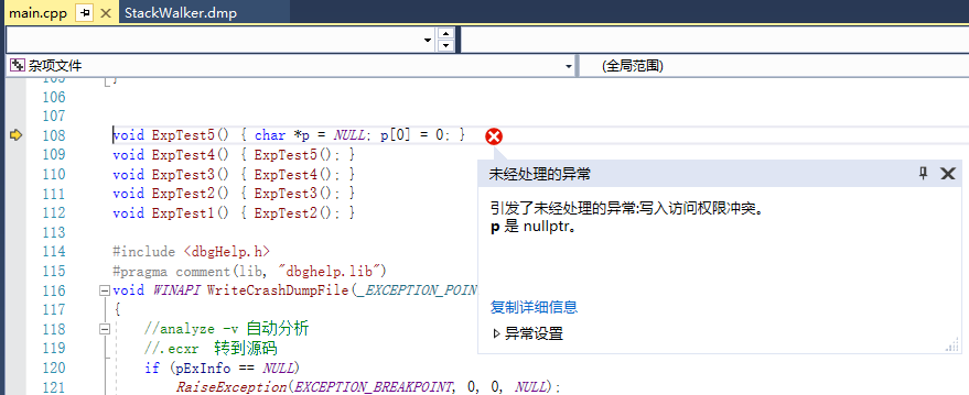 提示p是nullptr。一位曾经工作于中科院的学者告诉我,程序运行过程中出现错误提示,90%都是错误指针(空指针、野指针)引起的,鉴于多年工作经验的总结,对于这一点我深信无疑。IDE环境下运行,我们很容易发现和解决类似这种错误,但是如果我们脱离IDE运行,一般都会提示0xC0000005错误提示对话框,这个时候要解决这种问题就有些茫然了,手足无措,不知如何下手了。要解决类似这种问题,我们需要借助应用程序异常调试信息记录文件CrashDump文件,那么我们如何来生成这样的文件呢?请看修改后的代码: