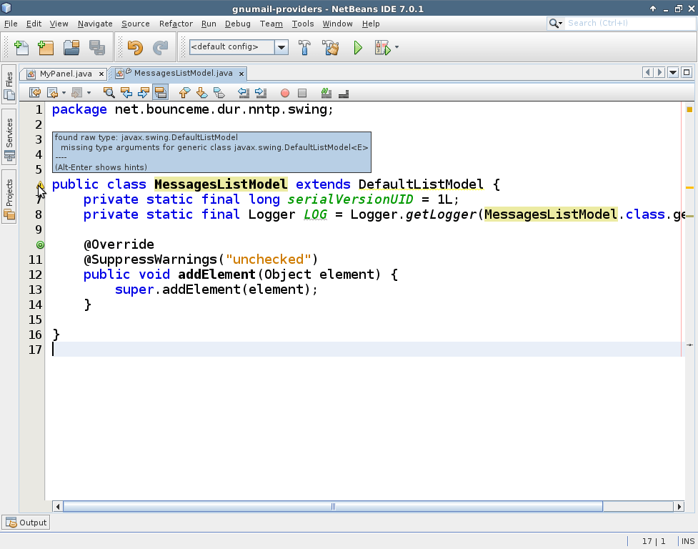 From Java 7 DefaultListModel is considered as Generic class. See DefaultListModel . And while extending it you are not providing generic type to the DefaultListModel that you are extending. That's why your IDE is warning you.
