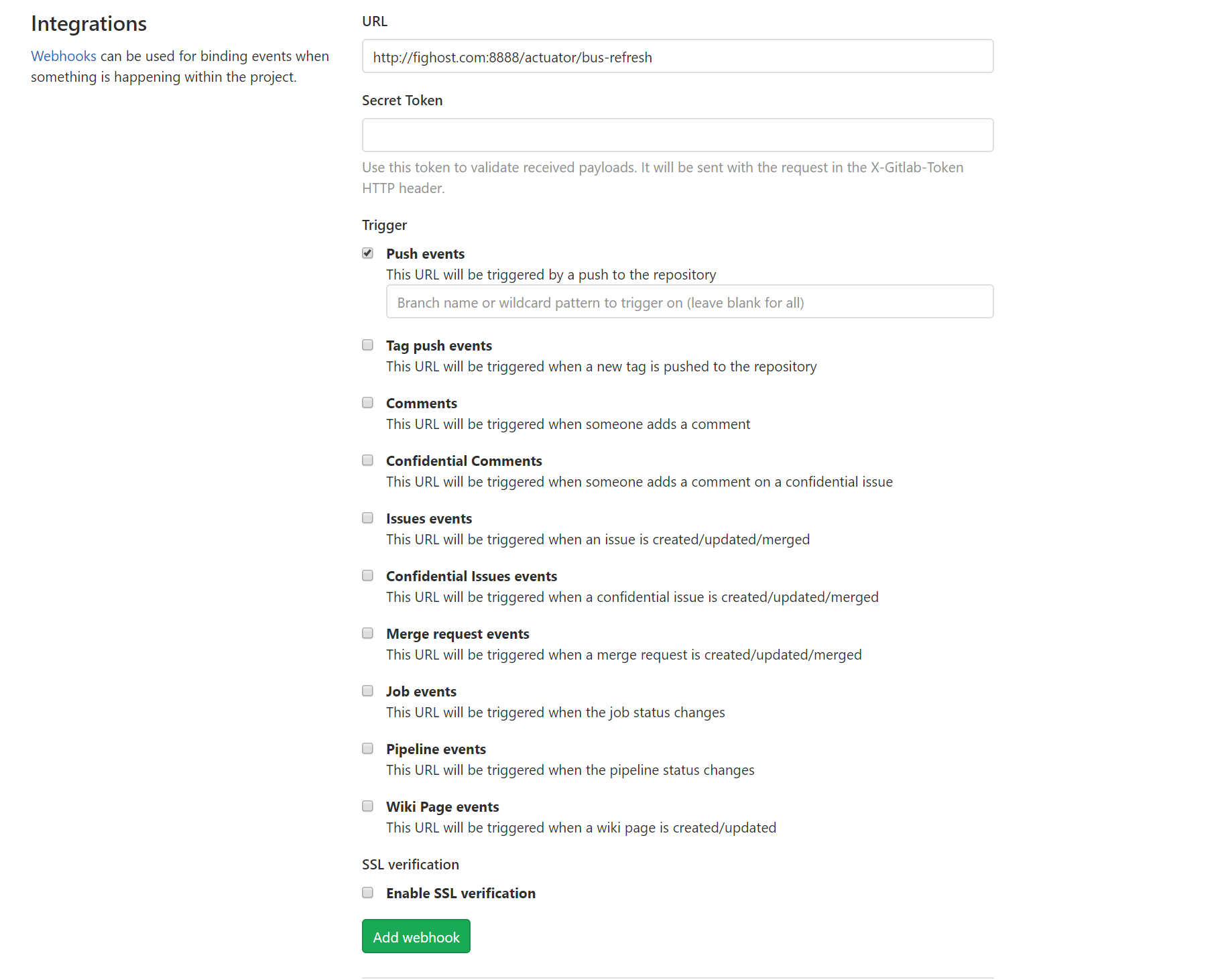 在GitLab中添加Spring Cloud Config 服务端配置刷新的回调地址。上述配置文件中配置的GitLab仓库若发生push event,GitLab将调用此地址通知配置中心。配置中心暴露的端点为/actuator/bus-refresh,对应源码中的RefreshBusEndpoint类。