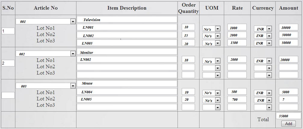 And the total also calculated based on the previous row cells.. If entering all the 3 cell values in every row means its working well.. if I am getting the error at the screen shot stage means it's calculating only 1'st cell values in all the rows..