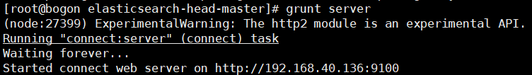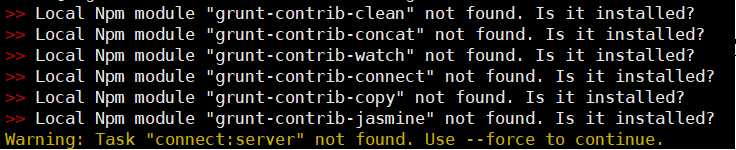 在elastic-search-head根目录挨个执行npm install -g cnpm --registry=https://registry.npm.taobao.orgcnpm install -g grunt-cli(安装全局grunt-cli)cnpm install grunt-contrib-cleancnpm install grunt-contrib-watchcnpm install grunt-contrib-connectcnpm install grunt-contrib-copycnpm install grunt-contrib-jasminecnpm install grunt-contrib-concat