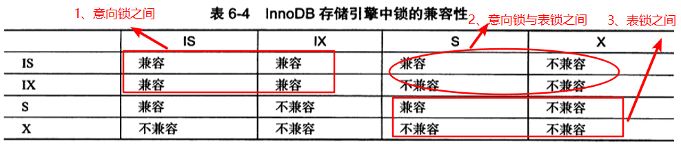 意向锁机制的工作方式:意向锁将锁定的对象分为多个层次(InnoDB存储引擎分为表级、行级两个层次),要想对最下层的对象(最细粒度的对象,行)上锁,需要先对上层对象上锁(粗粒度的对象,表)。也就是说,1)事务要想获得某些行的S锁,必须先获得表的IS锁; 2)事务要想获得某些行的X锁,必须先获得表的IX锁。 而获得各种锁的兼容性如下图所示: