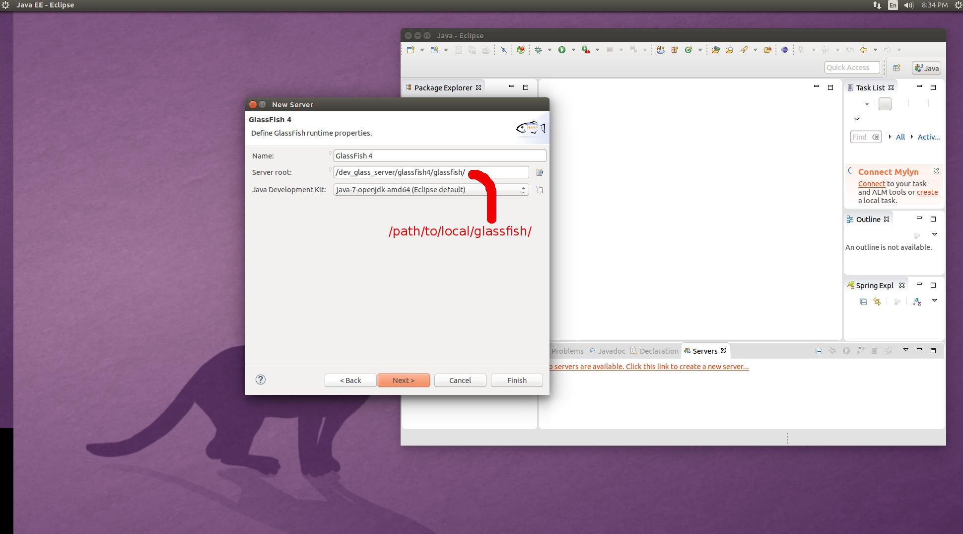 Then I wanted to add server for GlassFish4. But Eclipse is asking me for "Server root" and I have no clue what it means! I entered "10.0.1.12:4848/" just as I can access GlassFish from the host system (Mac OS) by a browser. But it just doesn't accept that URL. It seems to expect a local directory path. Here is the dialog box: