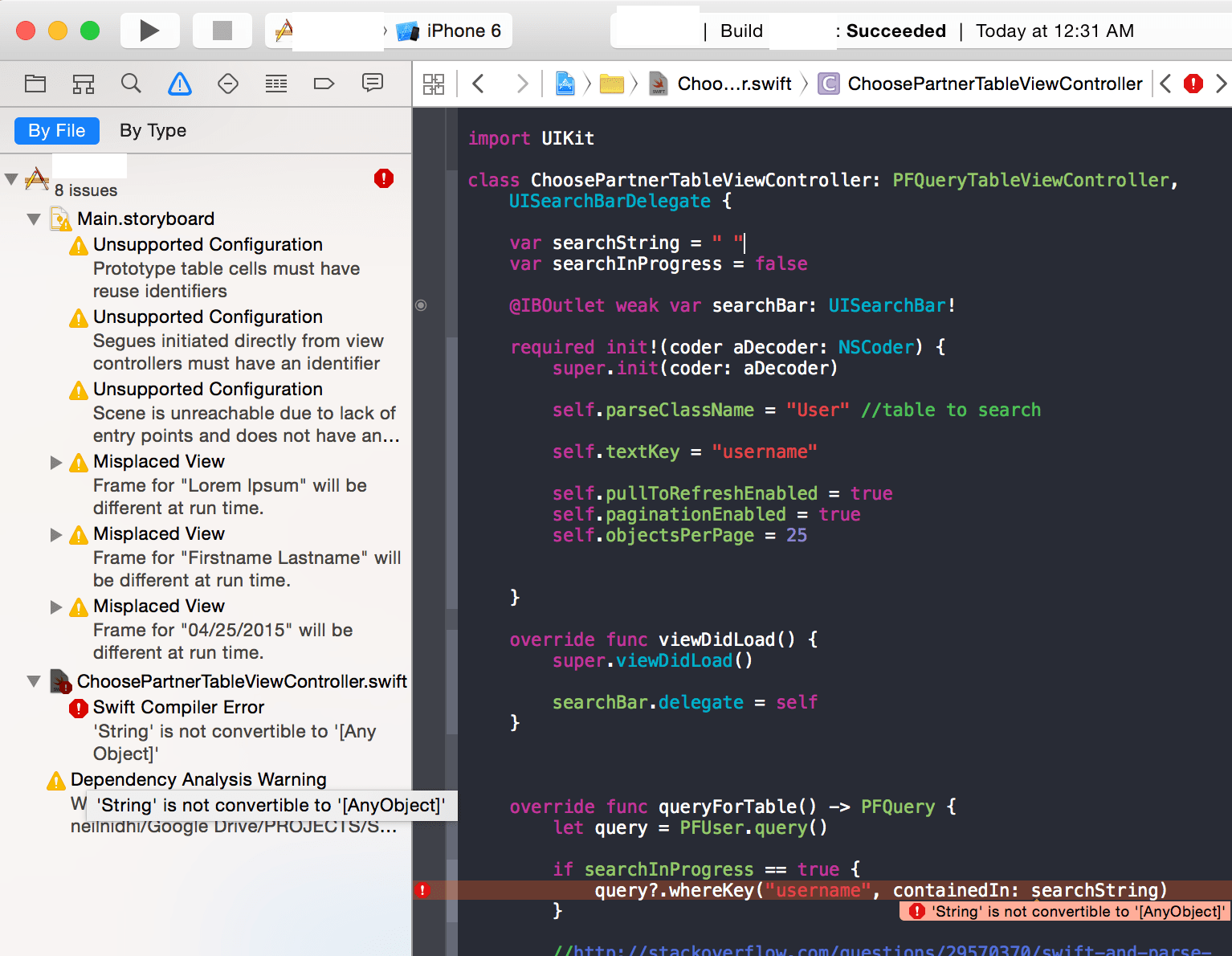 I am trying to do parse query as shown below: query?.whereKey("username", containedIn: searchString)