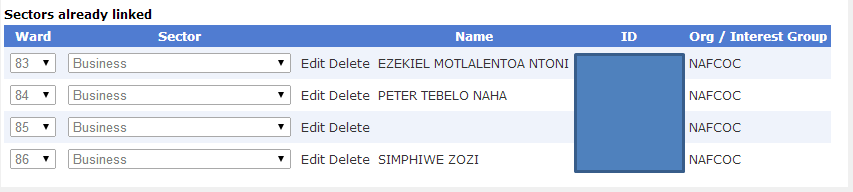 If Edit is clicked the <EditItemTemplate> for the row is displayed and the Ward and Sector values can be changed. The GridView is attached to an ObjectDataSource that is linked to a class that has the CRUD operations.