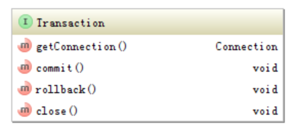 org.apache.ibaits.transaction.Transaction接口定义了获取Connection连接、提交、回滚和关闭的功能。