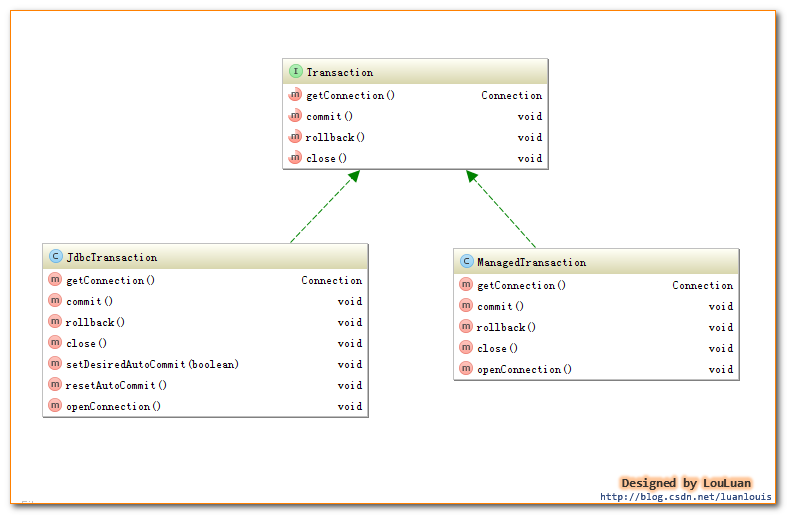 JdbcTransactionFactory会创建JDBC类型的Transaction,即JdbcTransaction。类似地,ManagedTransactionFactory也会创建ManagedTransaction。