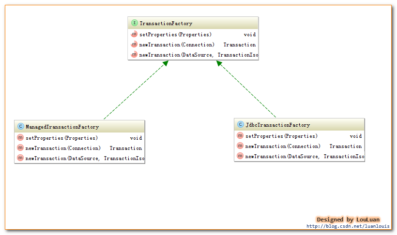 事务工厂Transaction定义了创建Transaction的两个方法:一个是通过指定的Connection对象创建Transaction,另外是通过数据源DataSource来创建Transaction。与JDBC 和MANAGED两种Transaction相对应,TransactionFactory有两个对应的实现的子类: