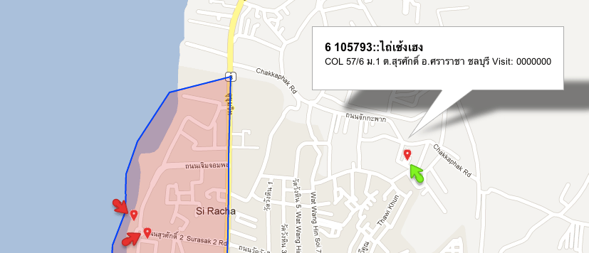 Problem: I can click (Green Arrow on image) and see data of description for points outside polygon but cannot (red arrows on image) of the ones geo-inside the polygon. I will like to see infowindows of those too, Poly AFAIK has no click listener.