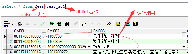 (6)、上面的步骤配置完,发现可以像使用oracle的表一样使用,select * from 表名/视图名@linkname,但是 select id from 表名@linkname 会报id标识符无效,也就是可以用*查询所有列,但是不能用列名查询指定列,解决办法是将列名用双引号引起来,并且双引号内列名区分大小写,如select "id" from 表名/视图名@linkname where“id”=‘A01’