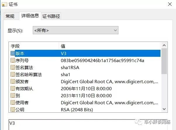 DigiCert Global Root CA作为一个权威CA,已经被浏览器预先安装在可信任根证书列表,那么我们信任该CA的一切,当然包括其公钥,在该证书里包含了明文的公钥,如下图所示: