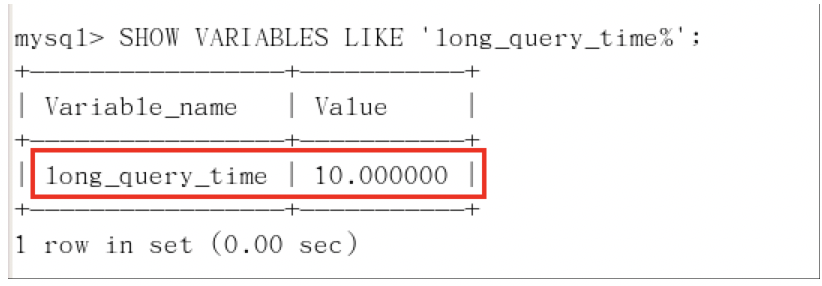 命令:SHOW VARIABLES LIKE 'long_query_time%';