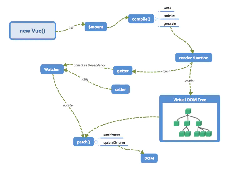 Vue.js 是在我们修改 data 中的数据后修改视图其实就是一个“setter -> Dep -> Watcher -> patch -> 视图”的过程。