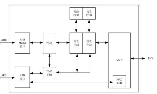 MAC 控制器支持 DMA 接收和发送,内部在接收和发送方向各有一个 2048 字节的 FIFO作为缓存。由于 FIFO 深度所限,MAC 控制器不支持硬件自动流控机制。