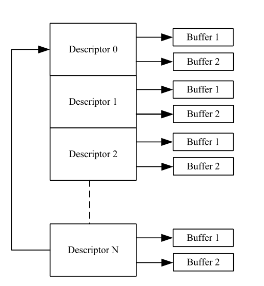 DMA 模块有独立的发送和接收引擎,进行系统内存与 MAC 间的数据搬运,将 CPU 的 干预最小化,只在帧发送或接收结束以及其他一些条件(如发生错误)下中断 CPU。 DMA 数据传输基于具有链表结构的 Descriptor 和数据缓冲区