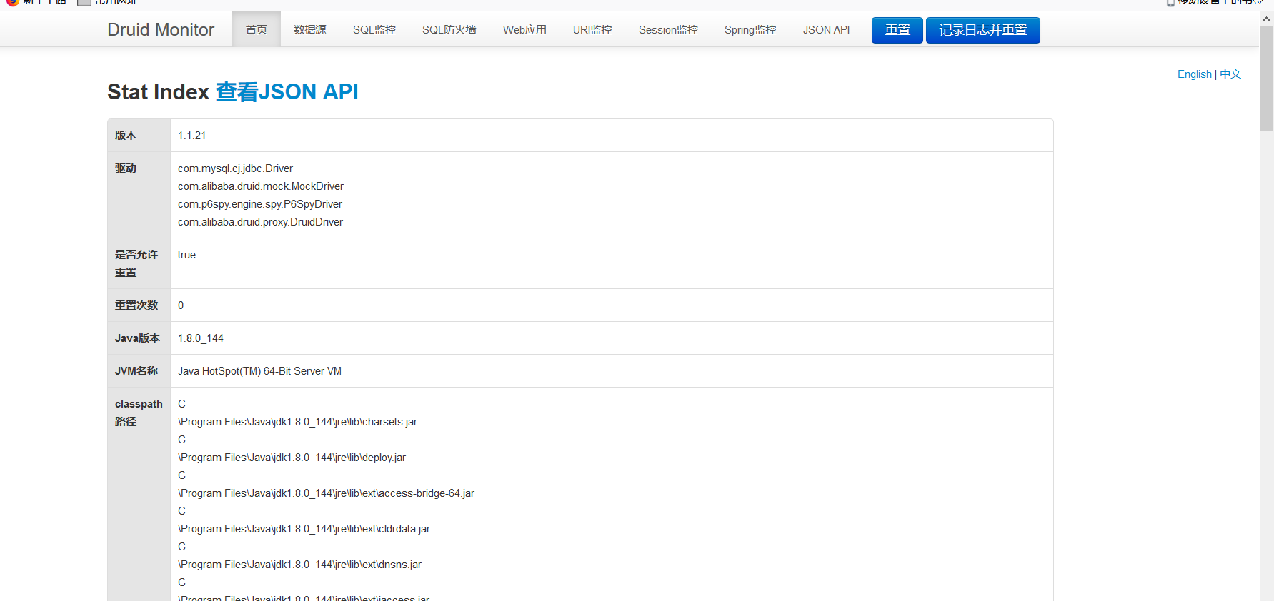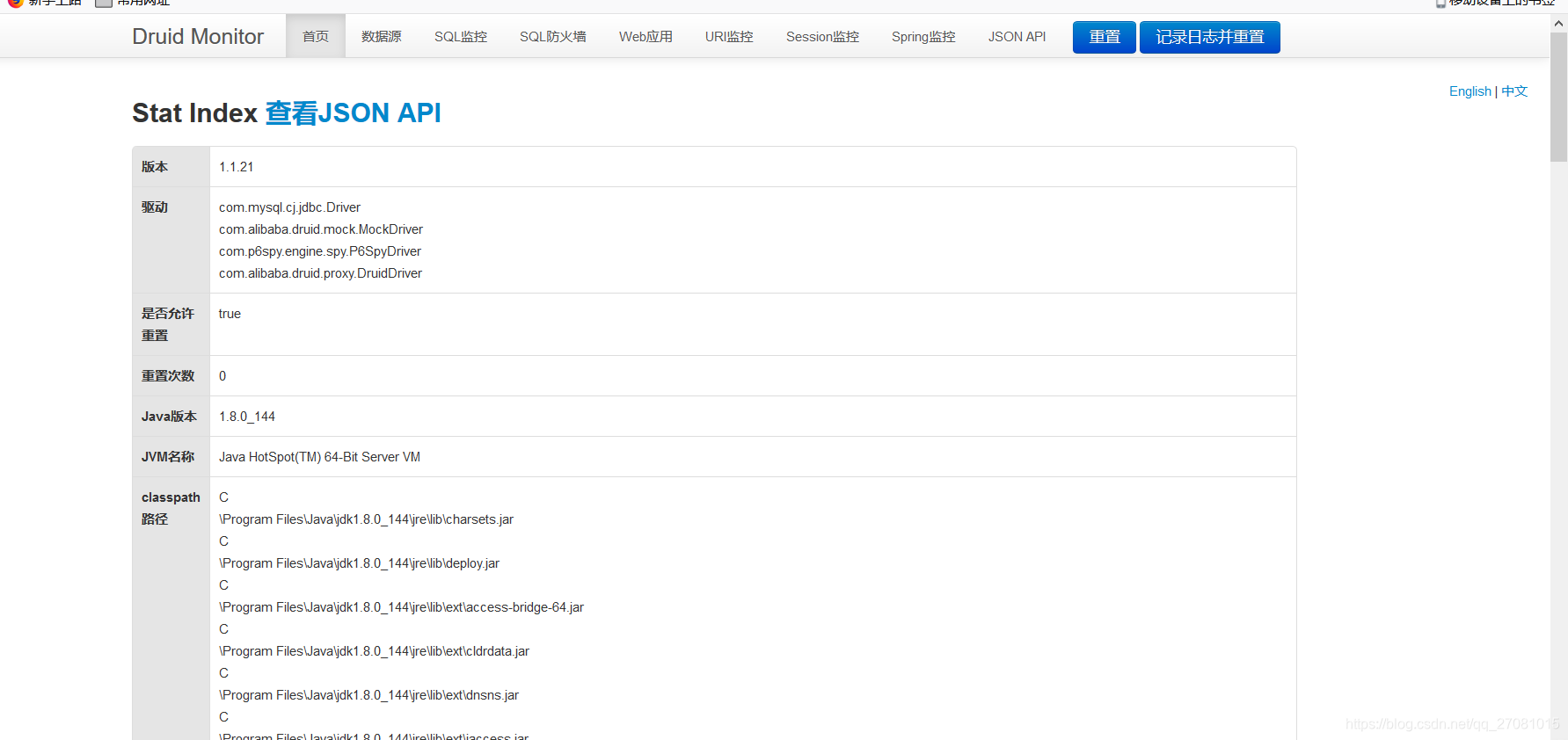 打开druid的监控页面查看当前数据源的相关信息,登录用户名密码在配置文件共配置了