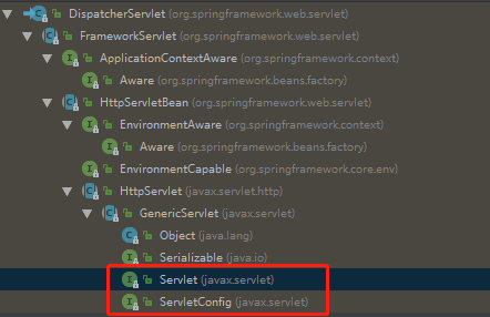 从层级能看出其顶层实现了Servlet和ServletConfig接口,由于Web容器只认识Servlet,而Spring只认识Bean,所以DispatcherServlet既是请求转发和返回视图解析控制中心,更是web与Spring的适配器,从其父子结构层级就能看出,慢慢的从Servlet适配到Bean的过程。