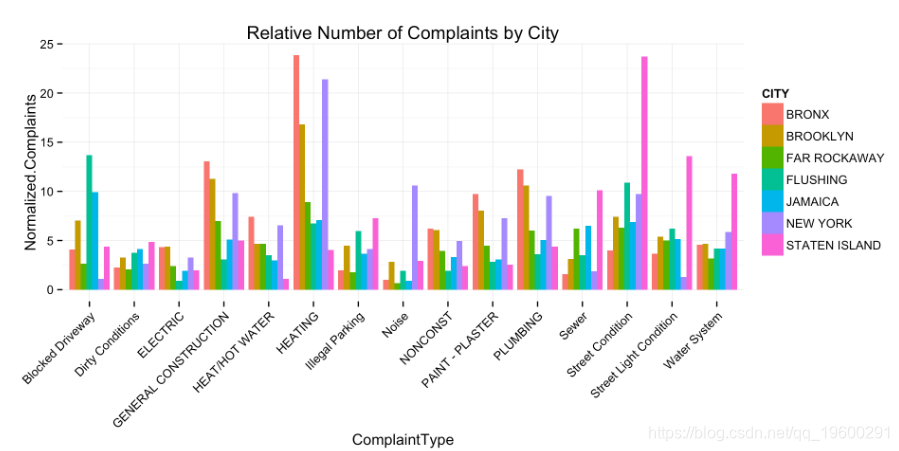 City和Complaint类型分组即可 完成同一任务。为了显示目的,我减少了此处绘制的项目数量。