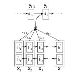 这是Bahdanau论文中的注意力模型示意图。此处使用的双向LSTM为每个输入句生成一个注释序列(h1,h2,.....,hTx)。其中用到的所有向量h1,h2…基本上都是编码器中前向和后向隐藏状态的串联。
