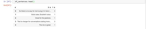 为简单起见,我们使用句子级别的数据文件(amazon_cells_labelled.txt,yelp_labelled.txt)。在读取合并了两个数据文件后,数据如下图所示: