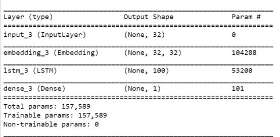 这里使用了嵌入层,紧接着是LSTM层。嵌入层采用32维向量,每个向量对应一个句子,然后输出(32,32)维矩阵,也就是说,生成与每个词相对应的32维向量。在模型训练中学习这种嵌入。
