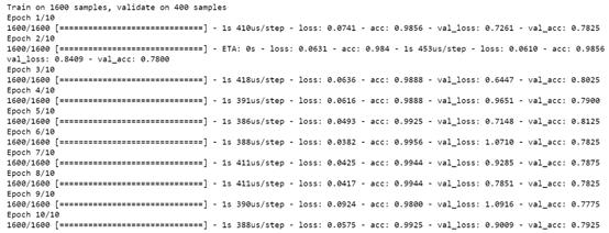 现在,输出变为100维向量,即LSTM的隐藏状态为100维。然后被传送到使用‘sigmoid’激活函数的前馈或密集层。使用具有二元交叉熵损失的 Adam优化器对模型进行训练。下文列出了10个周期的训练及模型结构: