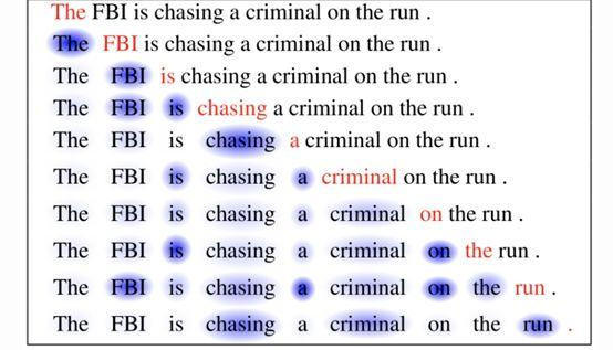 在逐字阅读或处理句子时,从阴影可以推断出,以前看过的单词得到了强调,这正是机器阅读器中的“自我注意力机制”所做的事情。