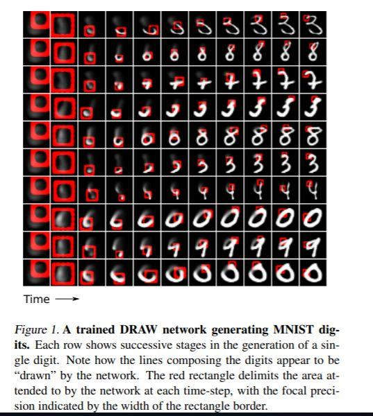 下图取自参考论文,显示了DRAW生成MNIST图像的步骤:
