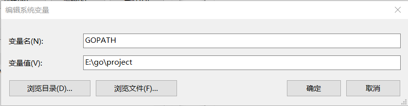 GOPATH= E:\go\project,意思是我的 GOPATH 是 e:\xxx 这个路径,以后我把这个路径作为 go 项目(代码、编辑文件、可执行文件)的顶层路径。