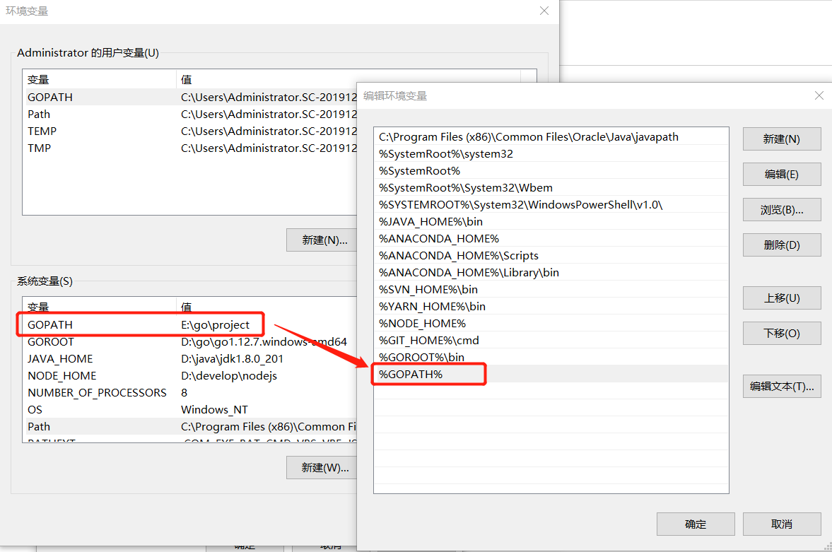 再添加一个名为GOPATH的环境变量,值为自定义路径,作用是“管理你的go项目”。