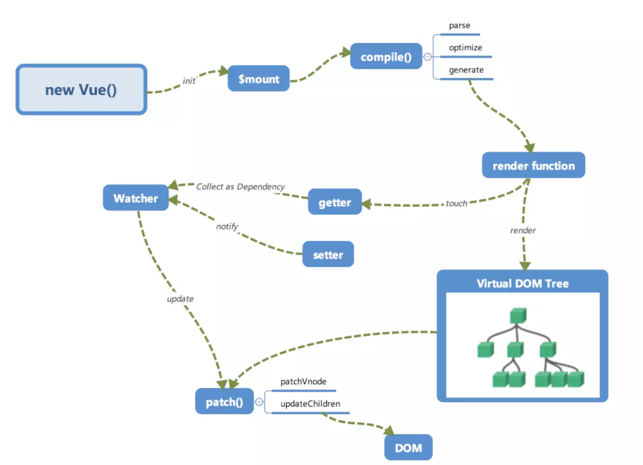 总之,react的性能优化需要手动去做,而vue的性能优化是自动的,但是vue的响应式机制也有问题,就是当state特别多的时候,Watcher也会很多,会导致卡顿,所以大型应用(状态特别多的)一般用react,更加可控。