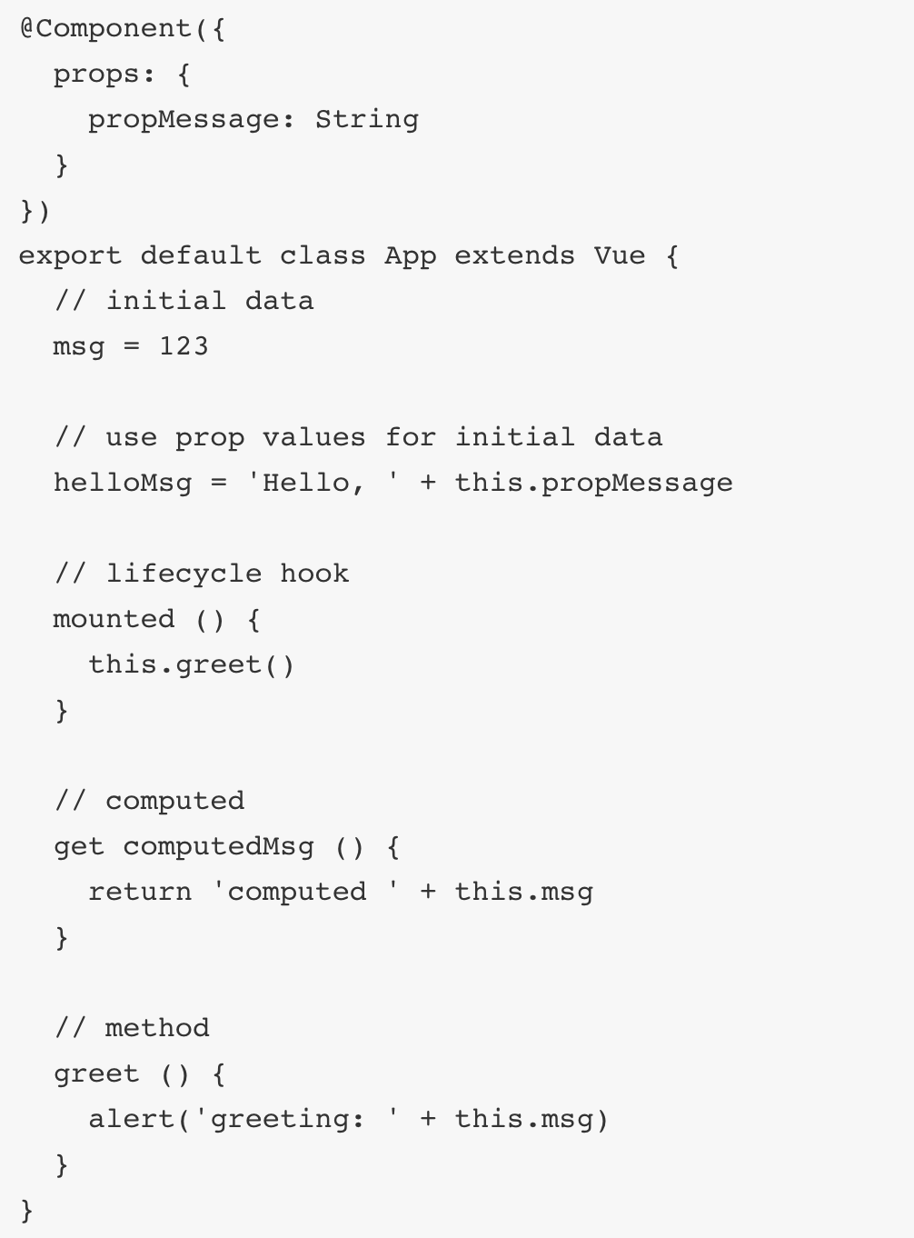 vue结合vue-class-component也可以实现类式的写法,但是还是需要通过decorator来添加声明,并不纯粹。