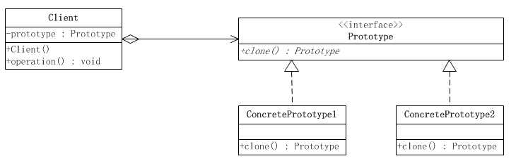 - 抽象原型(Prototype):这是一个抽象角色,通常是一个Java接口或者抽象类。此角色定义了的具体原型类所需的实现的方法。