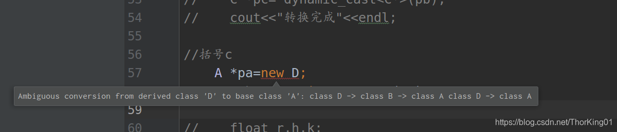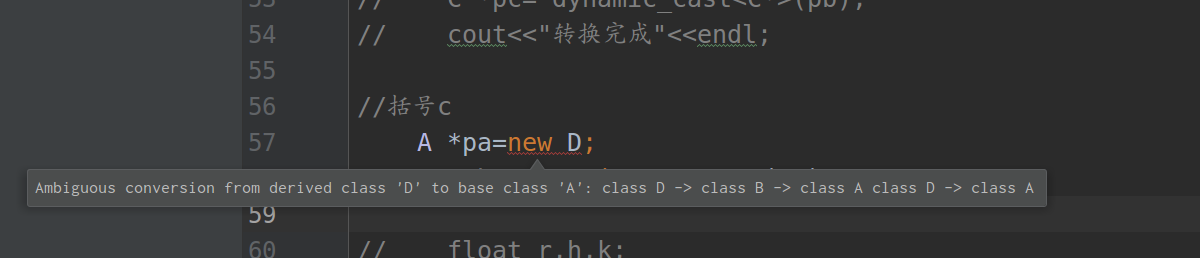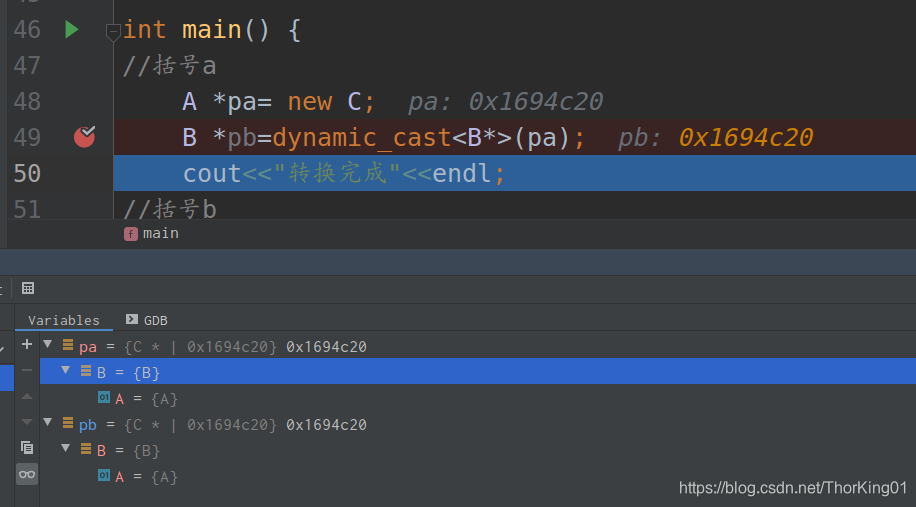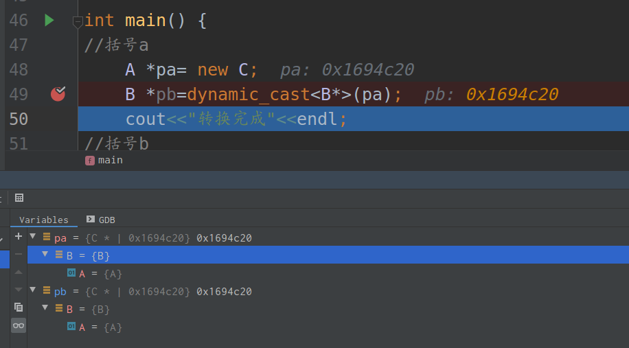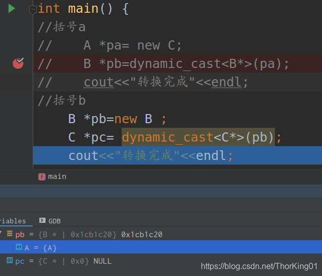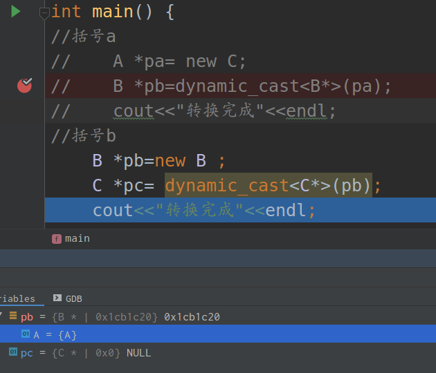 转换之后,pc为空,表示没有转换成功。B是C的基类。