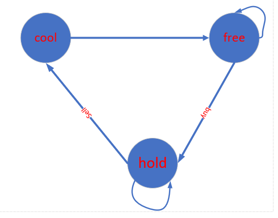 - 若当前状态为hold: 则下一天可以继续持有股票(hold),也可以卖出股票进入cool