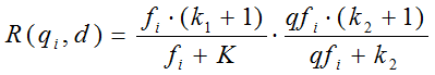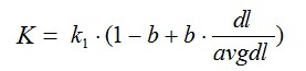 fi词q在文档1中出现的频率。k1 = 2, b = 0.75,后面一项一般为1,dl是文档1的长度,avgdl是所以文档的平均长度,这样的话TF的值就归一化在一个区间了。
