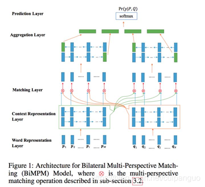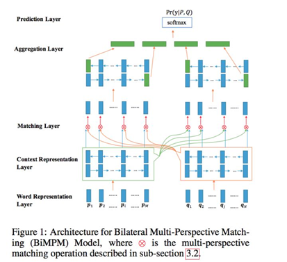BiMPM:两个文本长度是m和n,通过双向RNN分别计算两个文本的隐含层向量,再整合这些向量,文本1的还是m个,文本2的还是n,只不过现在都包含了彼此的信息,再分别放入RNN,然后去两个方向的最终结果,相当于4个向量拼接经过softmax。