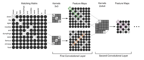 MatchPyramid:这个比较巧妙了,假设两个文本句子长度分别是m和n。利用glove向量或者之前训练过的向量得到一个相似度矩阵m*n,然后多个卷积核得到多个featureMap,再池化,再卷积,再池化,再全连接得到向量,使用softmax得到概率。