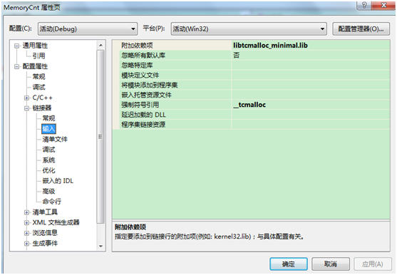 以DLL形式链接进入工程的主要步骤如下:首先从官网下载并解压gperftools包,下载地址为:http://code.google.com/p/gperftools/downloads/list,现有的版本是2.1;打开并编译gperftools-2.1目录下的gperftools.sln;编译通过后,在build输出目录下生成libtcmalloc_minimal.dll和对应的lib文件;将lib和dll文件拷贝到工程编译目录下,并在链接选项中添加两个配置,如下图所示:additional dependencies(附加依赖项): libtcmalloc_minimal.dll; force symbol references(强制符号引用):__tcmalloc (64bit 系统);重新编译链接后,exe运行时tcmalloc将在程序静态变量初始化阶段拦截所有原生内存管理接口。
