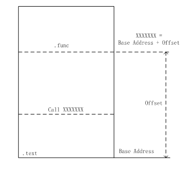 的汇编指令存在,其中XXXXXXXX表示程序运行时的函数虚拟地址。由于本模块PE文件各个段的布局和相应加载地址是在链接时决定,所以对于本模块内的函数调用可以在链接时就计算得到相应的函数地址,如下图所示,对某.text段中的.func函数进行调用,.func函数地址XXXXXXX可以通过将该段的加载地址和函数在段内的偏移两者相加得到: